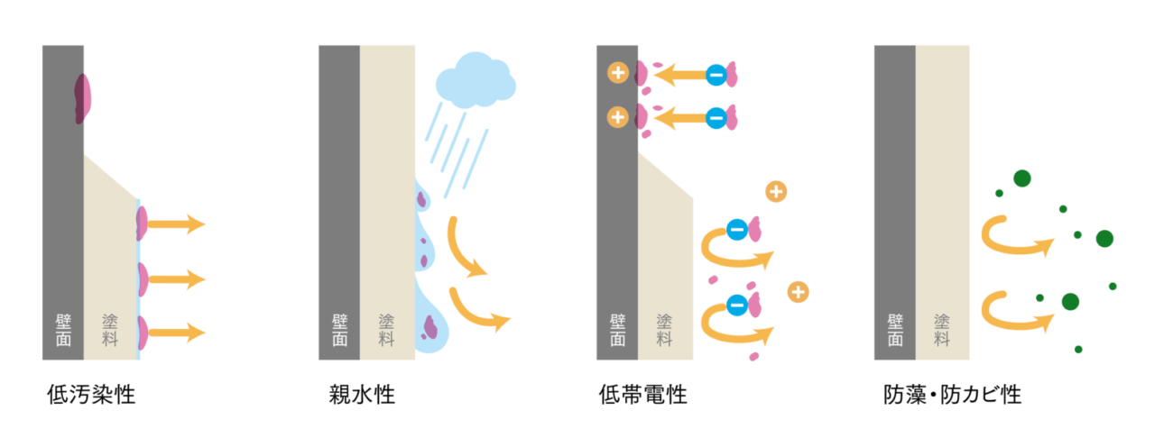 塗膜の親水性技術により、油の性質を持つ汚染物質とは馴染まず、雨水で自然に洗い流しやすくなります。また塗装表面が帯電しにくく、静電気を帯びた汚れも付着しにくくしています。